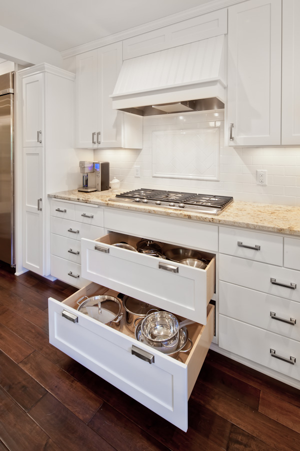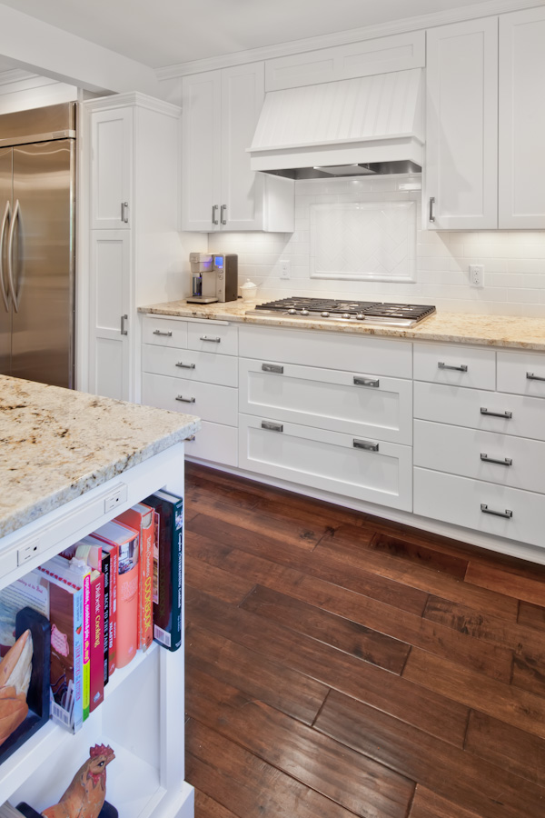 Features Beautiful custom-crafted prairie-style white-painted cabinets with eat-in center island. Eco-friendly hand-scraped engineered flooring. Baking center counter and storage with cookbook and wine display on the ends. Pot and pan drawers, silverware and spice drawers, criss-cross corner base storage cabinet, natural granite countertops and subway tile backsplash with feature tile at range, walk-in pantry.