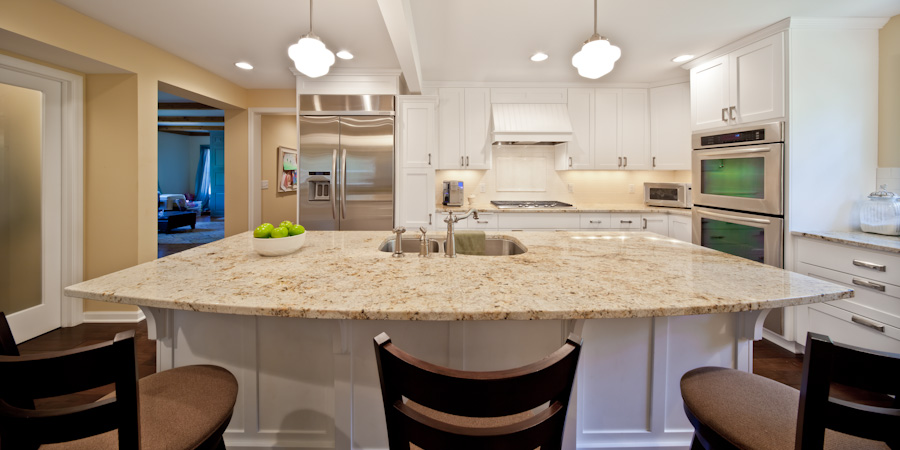 Afton 15 Farmhouse Kitchen Updated This client’s 1910 farmhouse had seen many additions over the years and was long overdue for an extensive kitchen remodeling. Its cramped layout restricted the room’s capacity and uses, but the client had grand visions of their kids gathering around the kitchen table and eating, baking, or doing the many crafts projects they enjoyed together. In the end, a modest four-foot expansion achieved enough space to accommodate a center island as a gathering place and storage-friendly baking station.