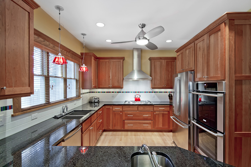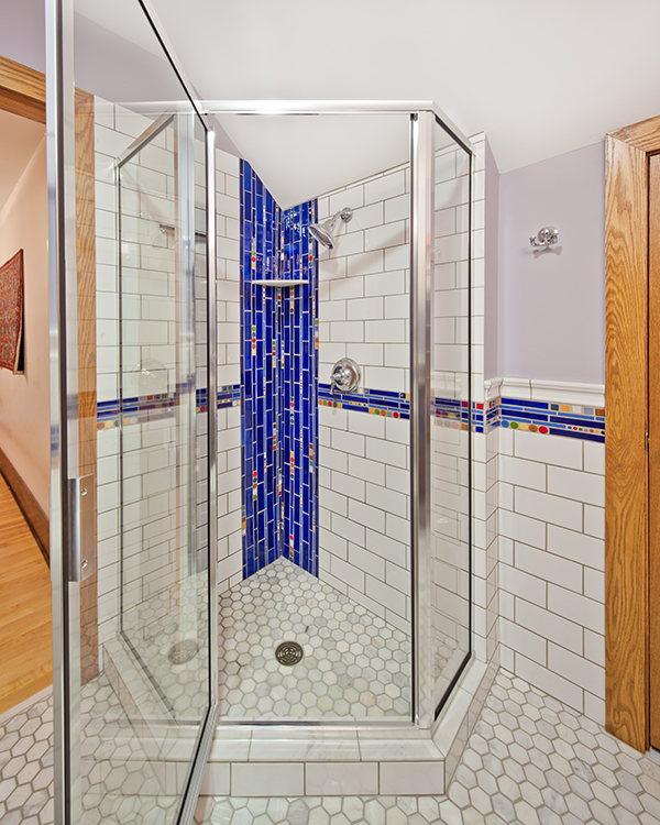 Features Custom cherry cabinets, natural granite countertops, porcelain subway tile with custom glass accent tiles.