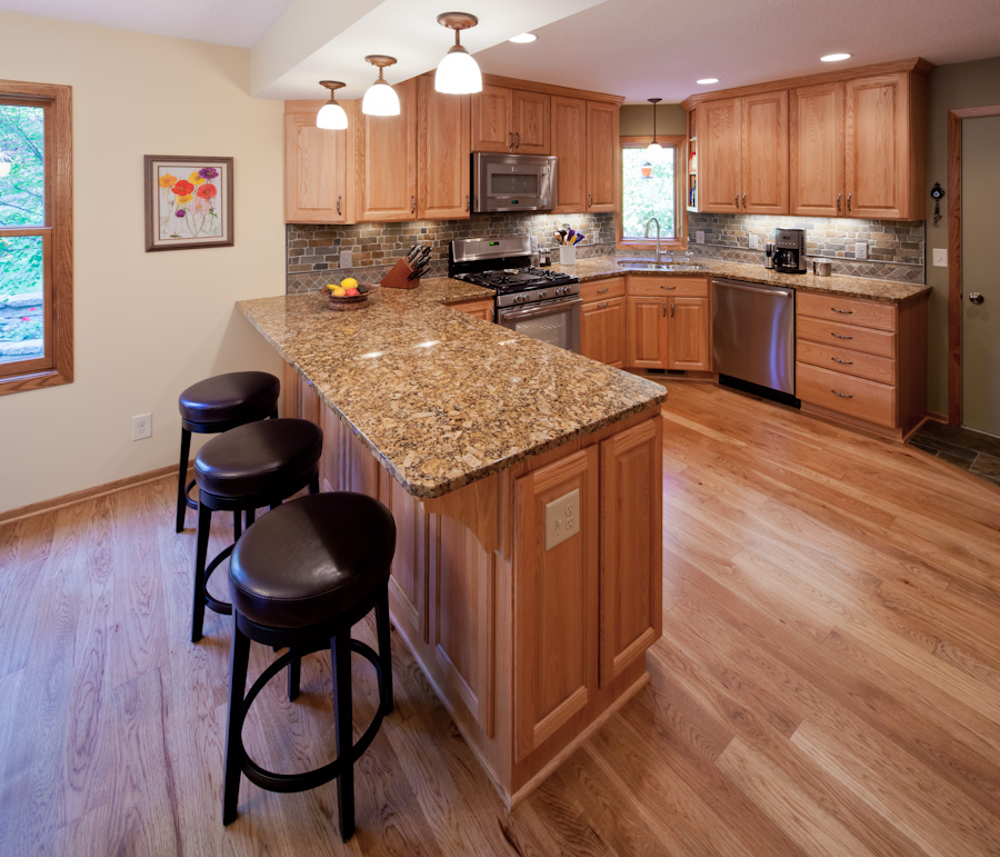 Features Custom red oak cabinetry, natural granite countertops, stone and porcelain tile mix, and hickory flooring.