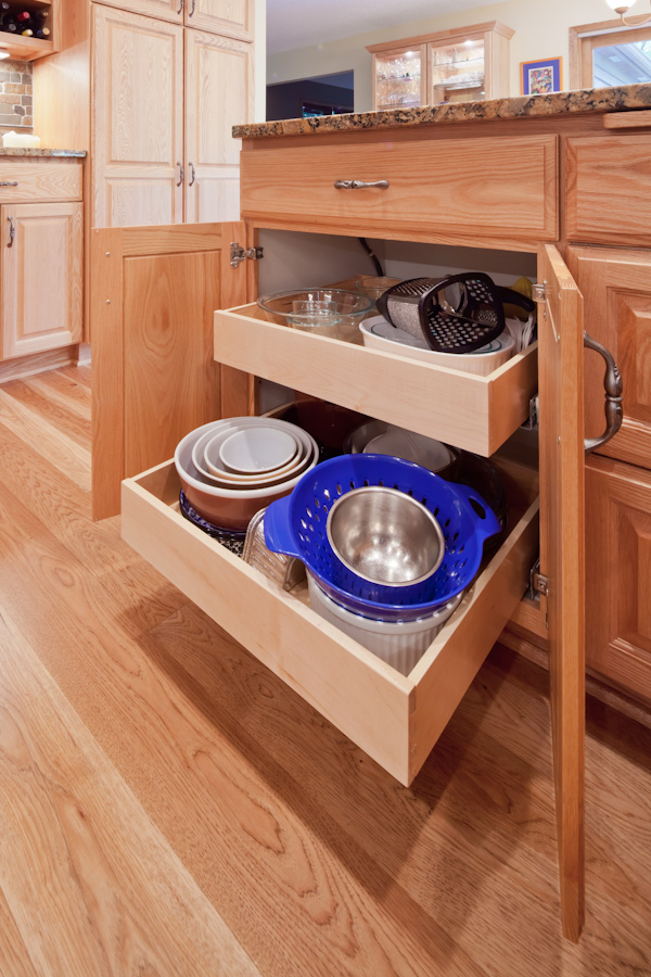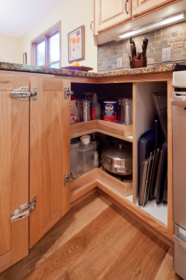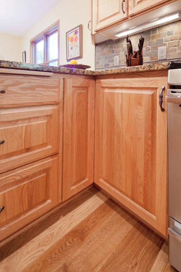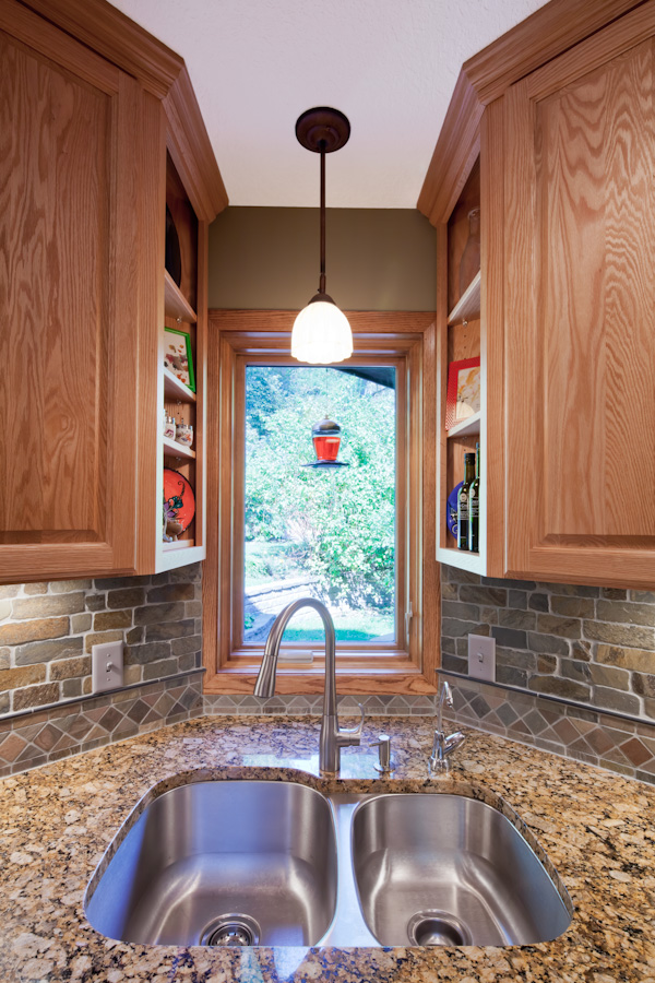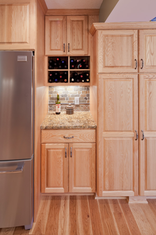 Lakeland Township Kitchen Remodel Dated and disjointed finish materials, along with worn and disorganized kitchen cabinets, prompted our clients to call the cabinet designers at Sawhorse. A hallway leading to the main level’s half bath awkwardly bisected the kitchen’s working space. Rerouting the access to the bathroom enabled a finely appointed beverage serving counter to be installed. New hickory flooring throughout the entire main level now unifies the home’s indoor atmosphere and reflects its wooded outdoor surroundings. Custom cabinetry with ergonomic accessories was integrated into a corner sink configuration, framing a window with a view of the wooded lot and frequent hummingbird visitors. The owners’ enhanced cooking experience has expanded entertainment possibilities made their home a destination for friends.