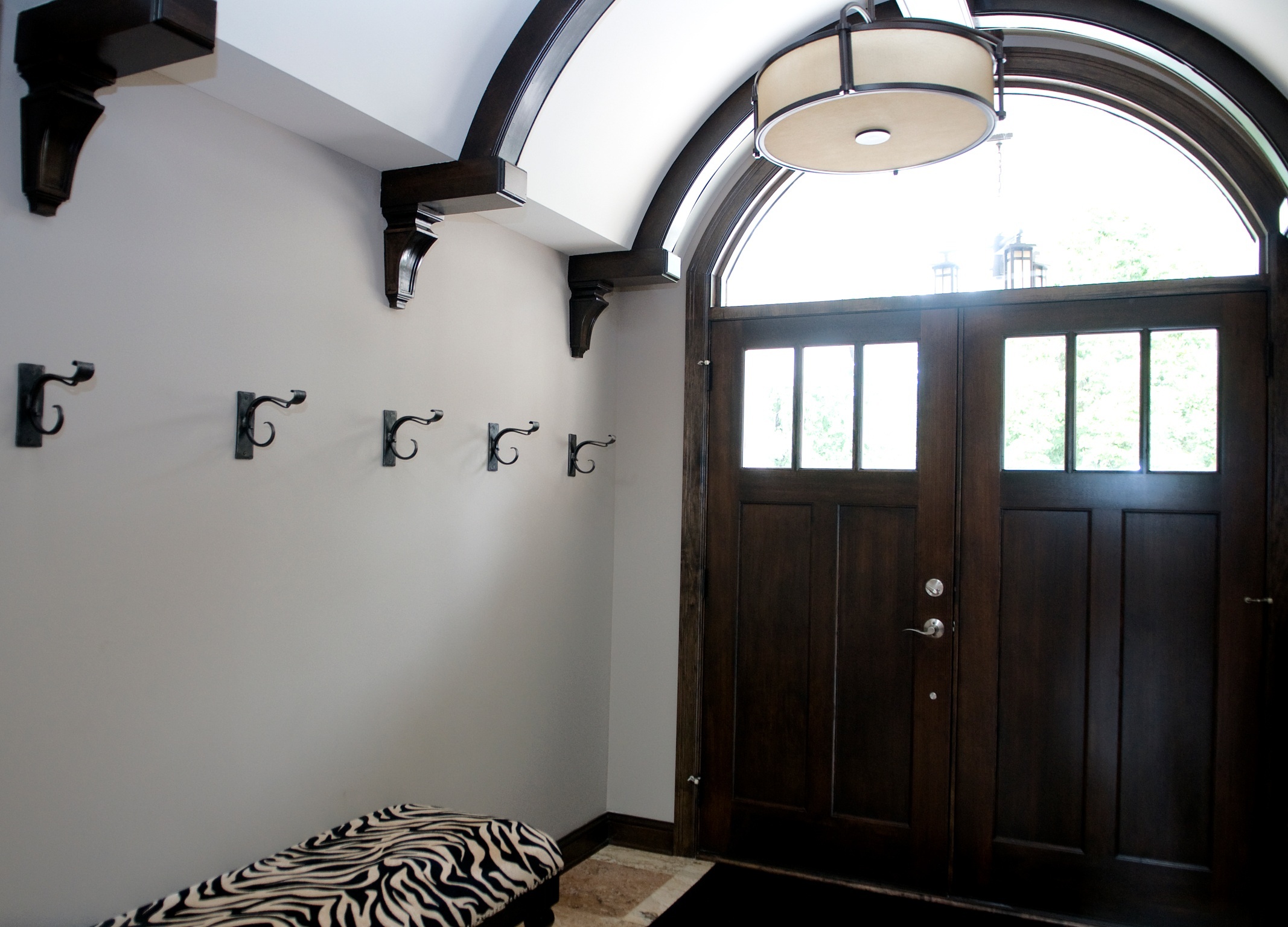 Lakeland Township Foyer The ten-foot-high ceilings on the main level allowed an elegantly detailed foyer design as part of this whole-house remodel. A series of ribbed arches creates the perception of a support structure in the barrel-vaulted entry ceiling, whose dark-stained maple beams are complemented by a similarly stained craftsman-style entry door. Wrought-iron coat hooks allow visitors to claim their spots.
