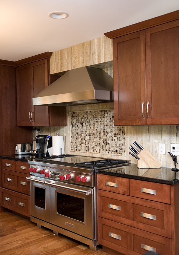 Features Custom dark-stained maple barrel-vault ribs, rustic alder entry door, marble tile floor.