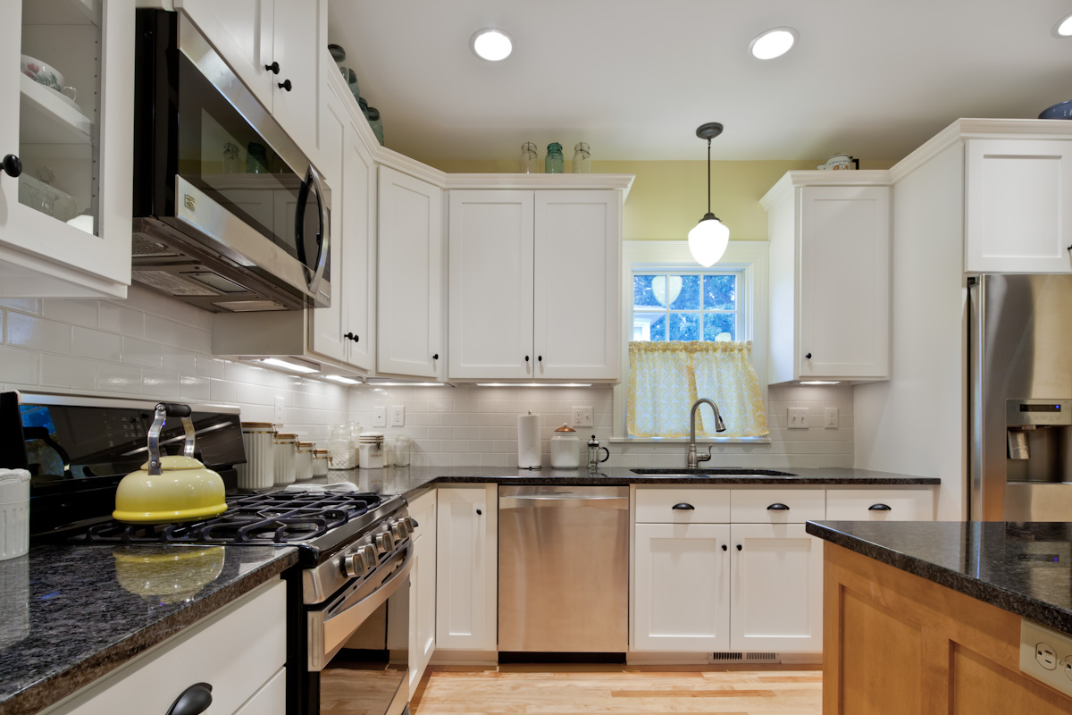 South Minneapolis Kitchen Remodel This client’s first priority for their early-1900s home was to replace a botched 1970s kitchen remodel whose compartmentalized dining space restricted entertainment possibilities. A bearing wall was removed and the hallway was widened to accommodate a rear entryway and main-level bath. The three-foot-wide window allows natural light to enter the formerly dim space and open up the kitchen/dining environment. Beautiful natural cherry craftsman-style cabinetry hearkened back to the era when this home was built. Granite countertops with exquisite subway and glass-inlay tile backsplash accent the beautiful remodel.