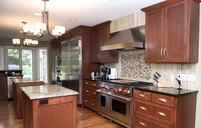 St. Paul Kitchen Remodel The kitchen in this 1.5-story Cape Cod was starved for space, with no access from the detached garage and no eating area. A modest six-foot addition transformed this kitchen—and the client’s daily life, enabling the back door from a newly completed deck to open directly into a mudroom cubby space. Cherry cabinetry offers ample daily storage and a discreet pair of doors conceals a phone recharging station and message center to help the family stay organized. An exquisitely designed eating nook with trestle table in matching cherry, and a center island gas cooktop, both offer ample pullout storage. A nearly ten-foot-wide doorway was created between the expanded kitchen and the adjacent living room, creating an open feel to the main floor. Craftsman-style details abound: cherry flat-panel doors, granite counters with porcelain backsplashes, and natural stone accent tile.